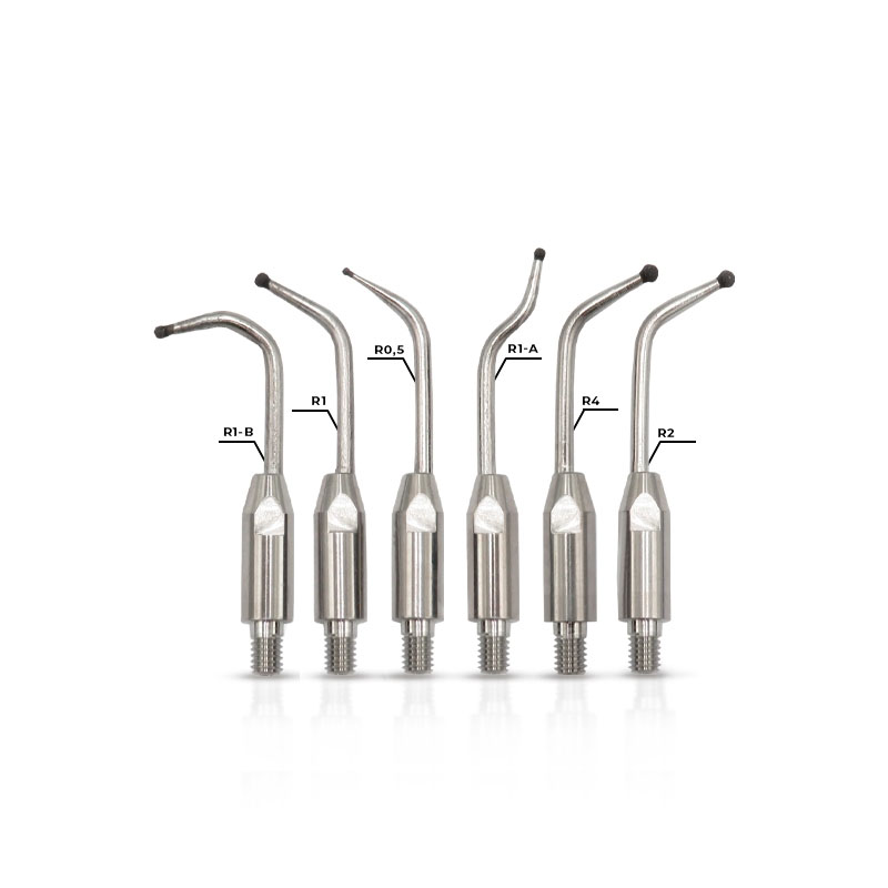 Kit recomendado para cavidades de todos os tamanhos: extremamente pequenas, médias e grandes, com acessos simples ou complexos. Composto por 6 pontas: R0,5; R1; R1-A; R1-B; R2; e R4.